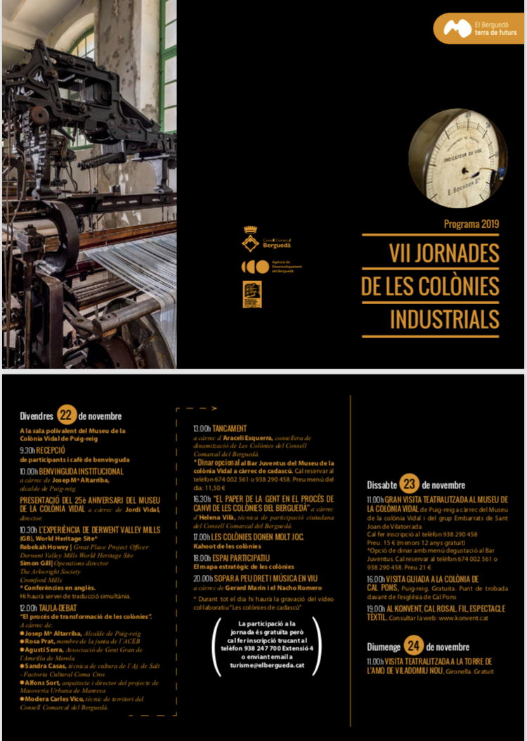 Enguany se celebren les VII Jornades de les colònies industrials, organitzades per l’Agència de Desenvolupament del Berguedà, el Consell Comarcal del Berguedà i el Museu de la Colònia Vidal, amb la col·laboració del Konvent de Cal Rosal, l’Associació de veïns de Cal Pons, Civitas Cultura i l’Ajuntament de Puig-reig. Serà els dies 22, 23 i 24 de novembre.